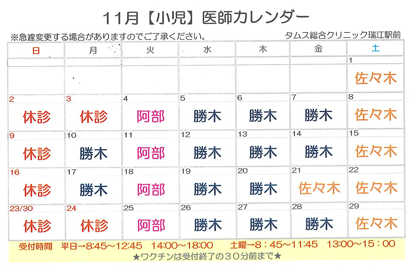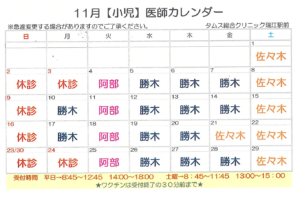 【11月】小児科 医師出勤表