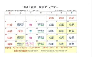 【1月】成島医師お休みのご連絡■ 2026年1月10日 1月の総合医師出勤表を更新しました。 1月13日(火)出勤予定でした整形医の成島医師ですが、瑞江病院の手術が入ったためお休みとさせていただきます。 急なご変更で大変申し訳ございません。次回の予定は【1月27日(火)】を予定をしております。ご理解とご協力のほどよろしくお願いいたします。